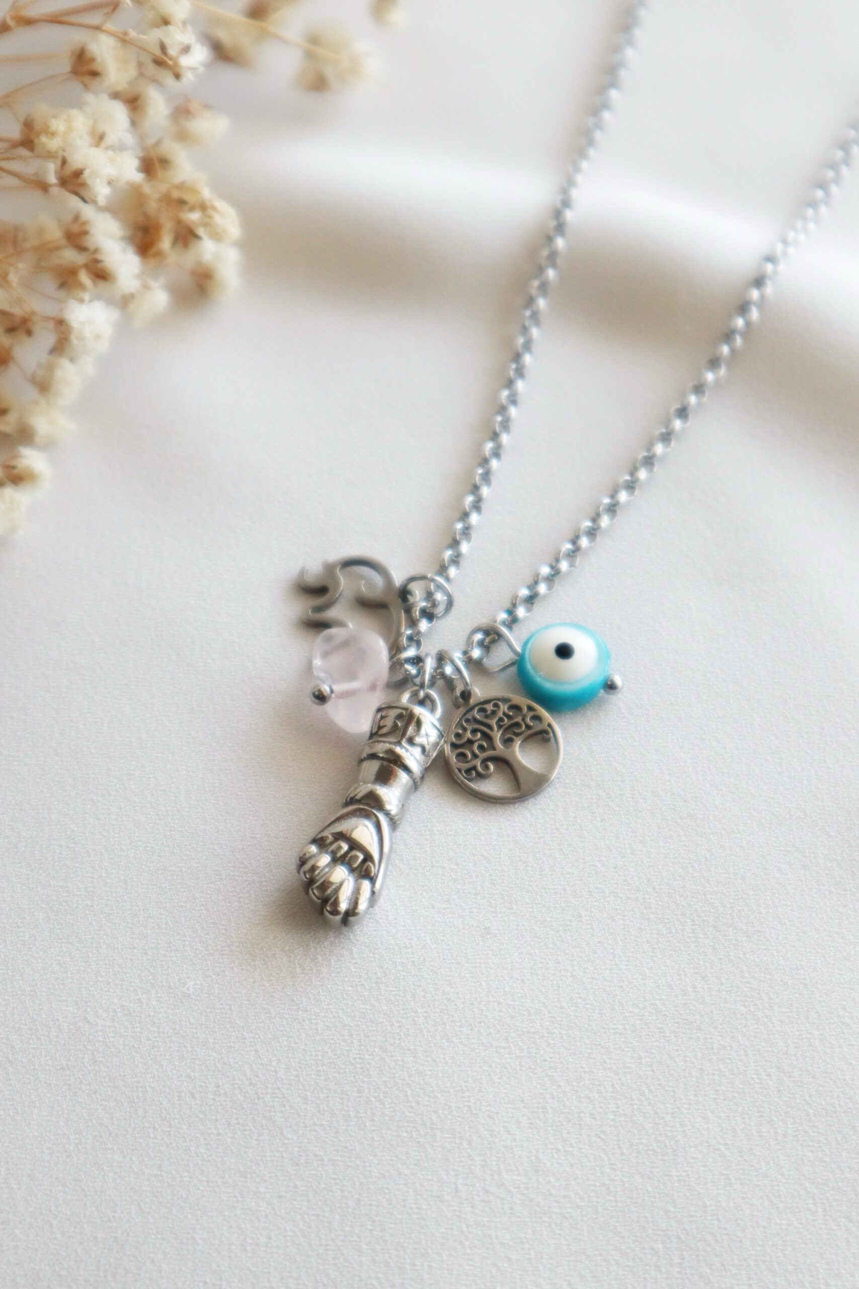 Colar em aço inoxidável com vários amuletos